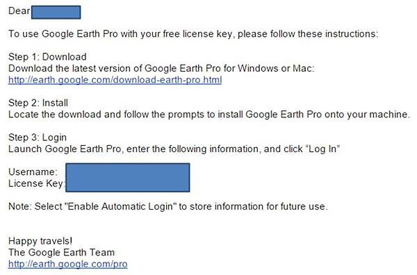 標題: [限時免費]Google Earth Pro 下載使用教學 [打印本頁] 作者: 匿名 時間: 2015-2-1 11:48 標題: [限時免費]Google Earth Pro 下載使用教學 Google 今天宣佈開放 Google Earth Pro (Google Earth 的專業版本)可以免費下載使用兩年. Google Earth Pro 專業版是個3D 的互動式地球儀,可用來協助規劃、分析和決策, 相較普通版可用於測量3D建築、介紹及報告列印高解析度圖像 及記錄高清HD影片. 過去 Google Earth Pro 是需要付費的 , 現在只需幾個步驟就可以免費使用 Google Earth Pro 兩年.
